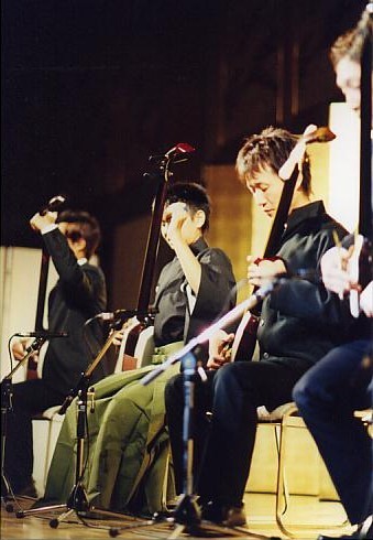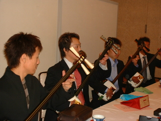 祝賀パーティ前のリラックスタイム、親方のハンドメイド三味線を興味津々に試奏している所。