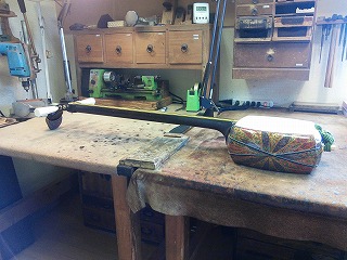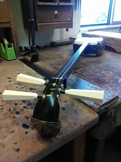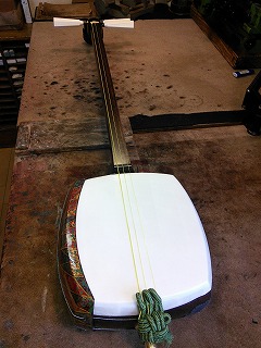 | 棹 | 昭和初期に作られた叩き三味線です(叩き=棹の丸めを手斧で施しています) |