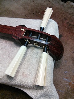 糸巻きに関しては古い本象牙の糸巻きに黒檀ジョイントを施した物となりますので、象牙部分には黄ばみがあります。